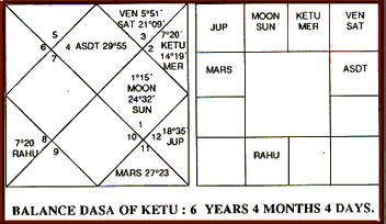The Moon is in its sign of debilitation. The fifth lord, Jupiter, along with Saturn, is under the close aspect of Ketu from the sixth house. The badly placed Sun and Mars are under the close aspect of Rahu from the twelfth house. Although Mercury is apparently well placed and unafflicted, the sub-period of Mercury was of little help due to the affliction of its dispositor. As soon as the sub-period of Mars in the dasa of Saturn started there were problems to the father in his business and from the Government. The circumstances at home created tension for the native. The onset of the sub-period of Rahu in the dasa of Saturn and the affliction of the Sun by Rahu triggered acute tension for the native that involved his father as well, as the Sun is a natural significator of father. In August 1994, the astral remedies were sought when the natal afflictions and the long duration were explained to the father. Though the astral remedies were started but to cut short the duration, more stress was placed by the father of the native on the psychiatric treatment in comparison to the astral remedies. The prolonged psychiatric treatment proved to be of no help and the native's father returned to astral remedies. The performance of astral remedies helped in steering the native clear of the problem. The child is now leading a normal life and participating in the family business. The problem, however, took the toll on studies.