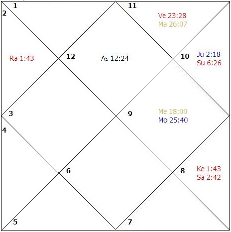 The sign Scorpio rises in the ascendant and Mars, Venus, Rahu and Ketu are the functional malefic planets. Jupiter and Saturn become prime determinant planets for marriage. Jupiter is weak as it is placed in its sign of debilitation in navamsa and its dispositor is weak. Saturn is weak as it is badly placed in the chart and its dispositor is weak and afflicted. Venus, the lord of the twelfth house, rules the continuity of married life. Venus and Mars are combust and are mutually conjunct with each other indicating conflicts in marital relationships. The Moon is weak as it is placed in its sign of debilitation. Mercury is weak as it is placed in the state of old-age. Saturn, the lord of the ascendant in navamsa occupies its sign of debilitation in D-IX and is closely influenced by the Rahu/Ketu axis. The significator for husband, Jupiter too, occupies its sign of debilitation in navamsa. The combustion and affliction of Venus and the utter weakness of Saturn and Jupiter did not bless the native with marital happiness. Her two marriages ended in divorce. The first survived for a few months and the second for a few days. The native could not compromise with the immoral character of the spouse. Both the divorces took place in the main period of Venus and the sub-period of Jupiter. The tenth lord, the Sun, occupies its own moolatrikona sign in the main chart and is under affliction from the already afflicted twelfth lord Venus. The tenth house does not have any close malefic aspect to its most effective point. Two functional malefic planets are placed in the tenth house. In dasamsa no mooltrikona sign rises in the ascendant. Therefore, the main impact in this chart is of the lord of the tenth house of the main chart, the Sun. The job held by the native is affluent so far as income is concerned as the lord of eleventh house Mercury is placed close to the most effective point, but does not possess the authority as signified by the sign Leo and its lord in the tenth house.