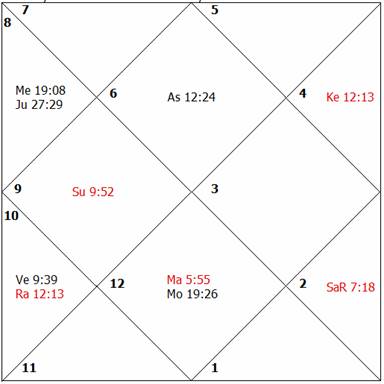 The sign Virgo rises in the ascendant. Saturn, Mars, Sun, Rahu and