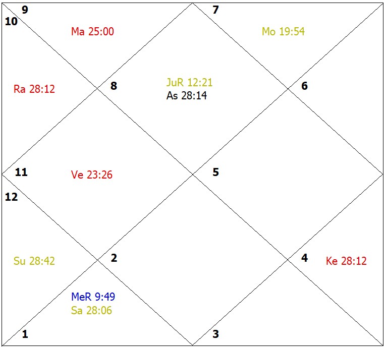 The sign Cancer rises in the ascendant. Mars and the Sun become the prime determinants of professional matters. The sign Pisces rises in the ascendant of dasamsa. No planet is placed in its sign of debilitation in dasamsa. Jupiter, Saturn, Rahu and Ketu act as functional malefic planets. Mercury acts as a Sun-like planet.